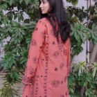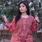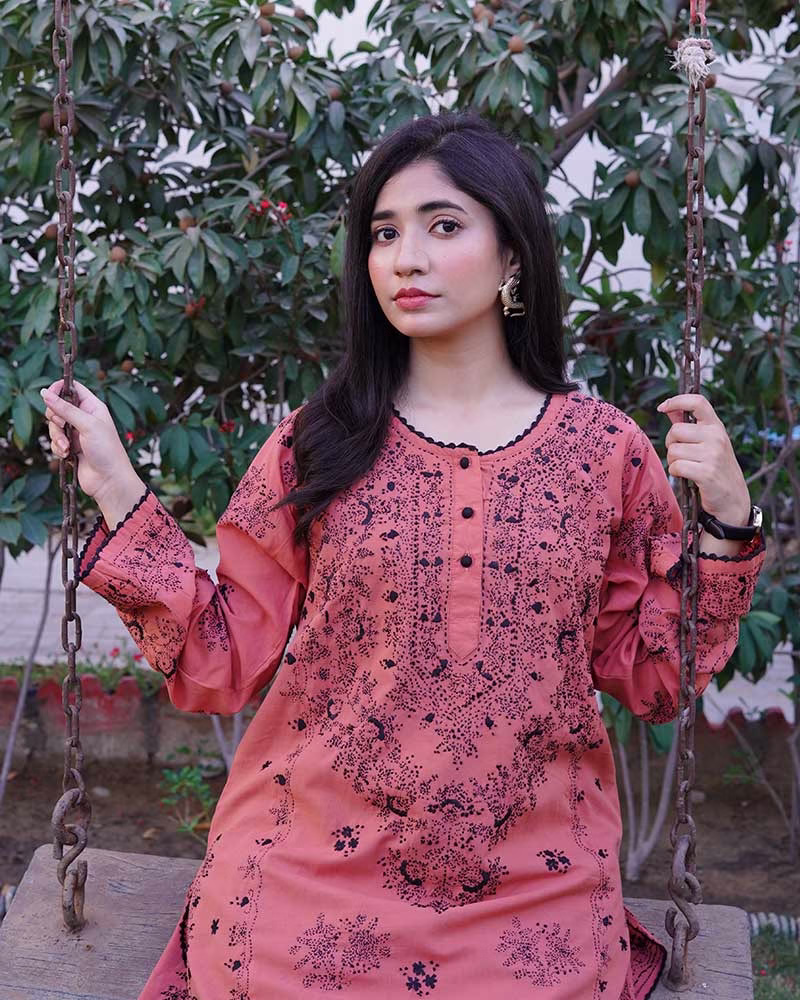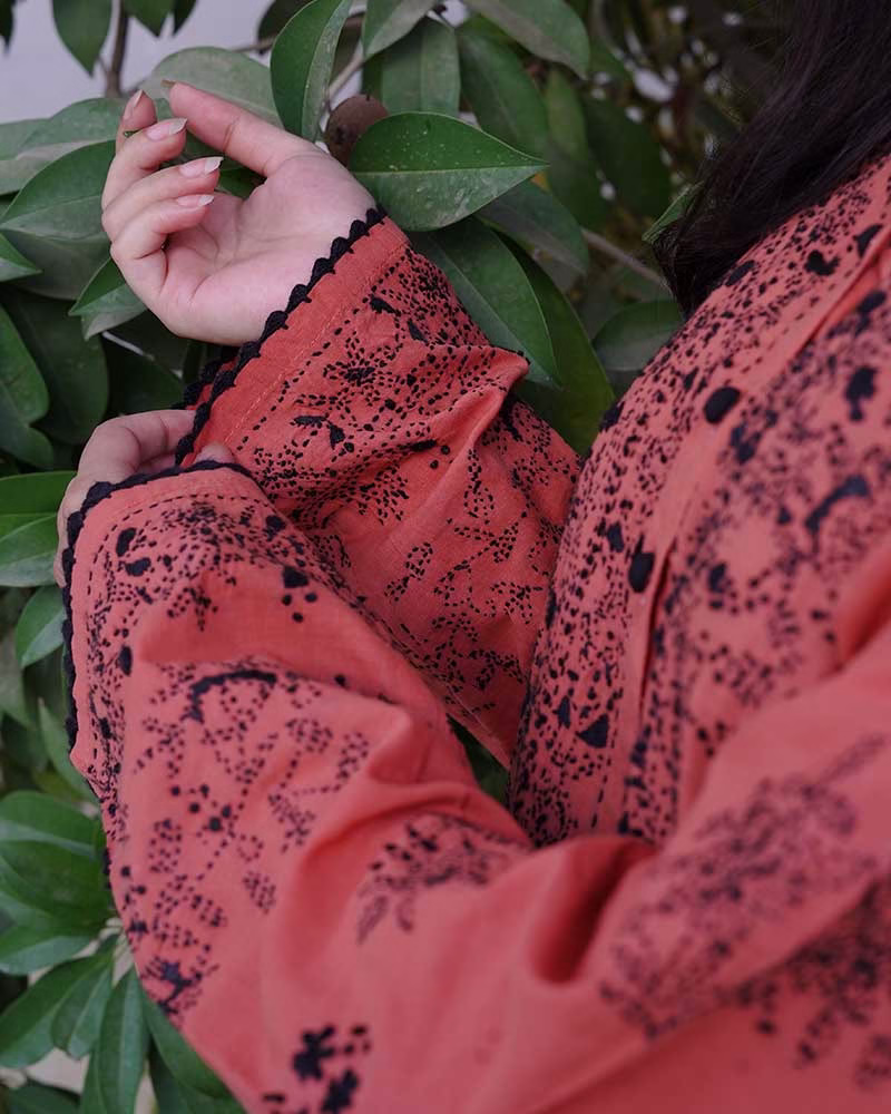 Delicately embroided 4 panelled kurta with front placket giving traditional vibes. The slaying jet black embroidery with mirrors over terracotta color is giving freshness from within. Feel confident in this dress this fall. This kurta is heavily embroided over front back and sleeves with handmade crochet detailing over the edges making it exclusive piece in your wardrobe.