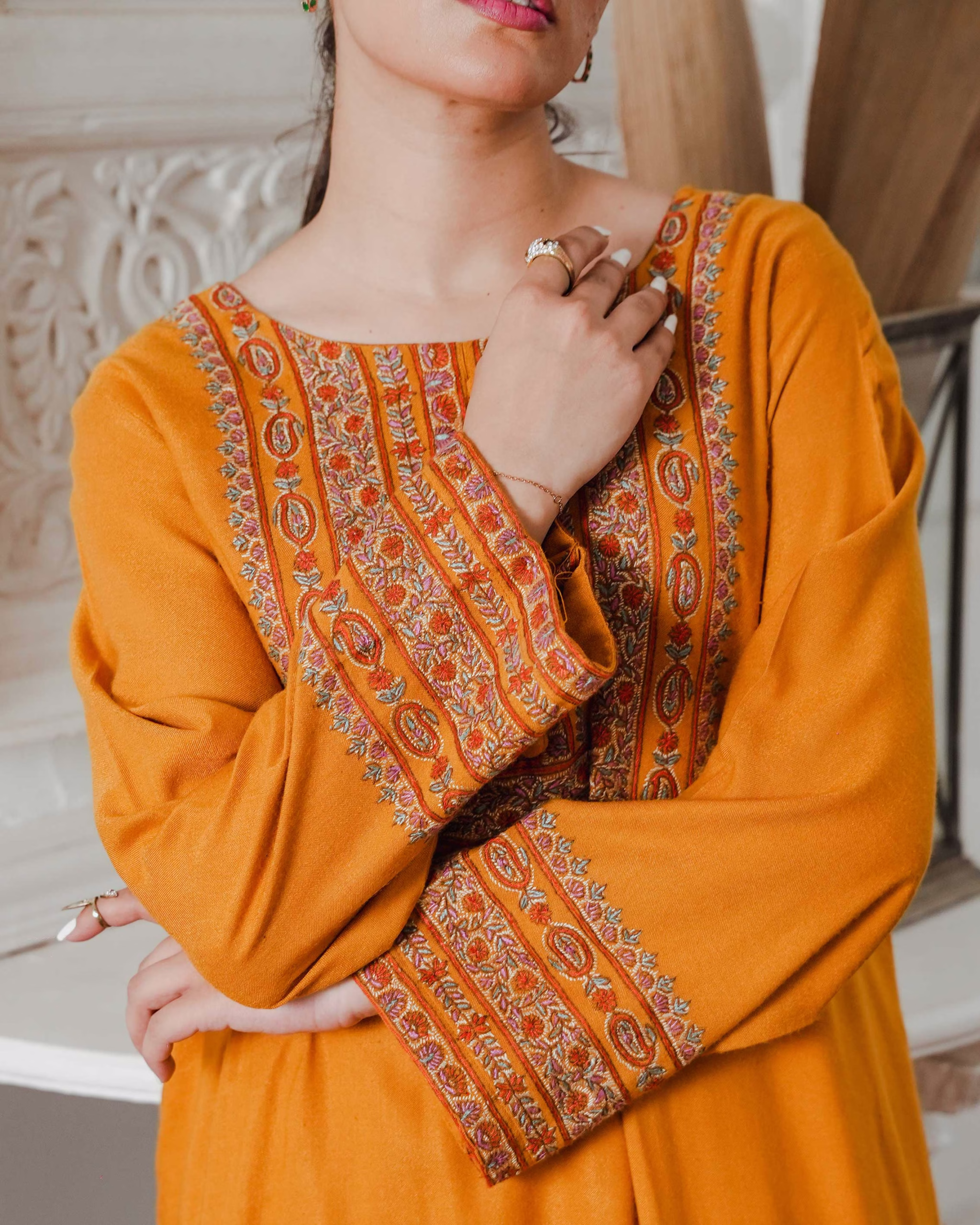 Indulge winters in rich Kashmiri intricate needle hand- embroidery with gorgeous patterns on specially weaved suede fabric.