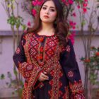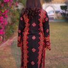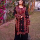 Uplift your ethnic wardrobe with this stunning four-paneled black Chikankari kurta, designed to exude charm and elegance. Authentic tribal embroidery, inspired by traditional Balochi craftsmanship, adorns the heavily embroidered front, back, and sleeves, making it irresistible to wear and flaunt. This ethnic ready-to-wear piece combines cultural artistry with contemporary style, perfect for any occasion. The intricate detailing and rich black fabric create a timeless look, ensuring you stand out with grace and sophistication.