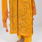 Captivate the attention by wearing beautifully handcrafted kantha work jaal all over the shirt with schiffli embroidery over daman extending to chaaks giving the contemporary feel. Smooth transition from daylight to night festivities. There is multi colored kantha embroidery over the shirt. Sleeves are having organza pleated detailing. Dupatta is pure chiffon with hand block print and pure silk tassels detailing.
