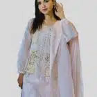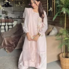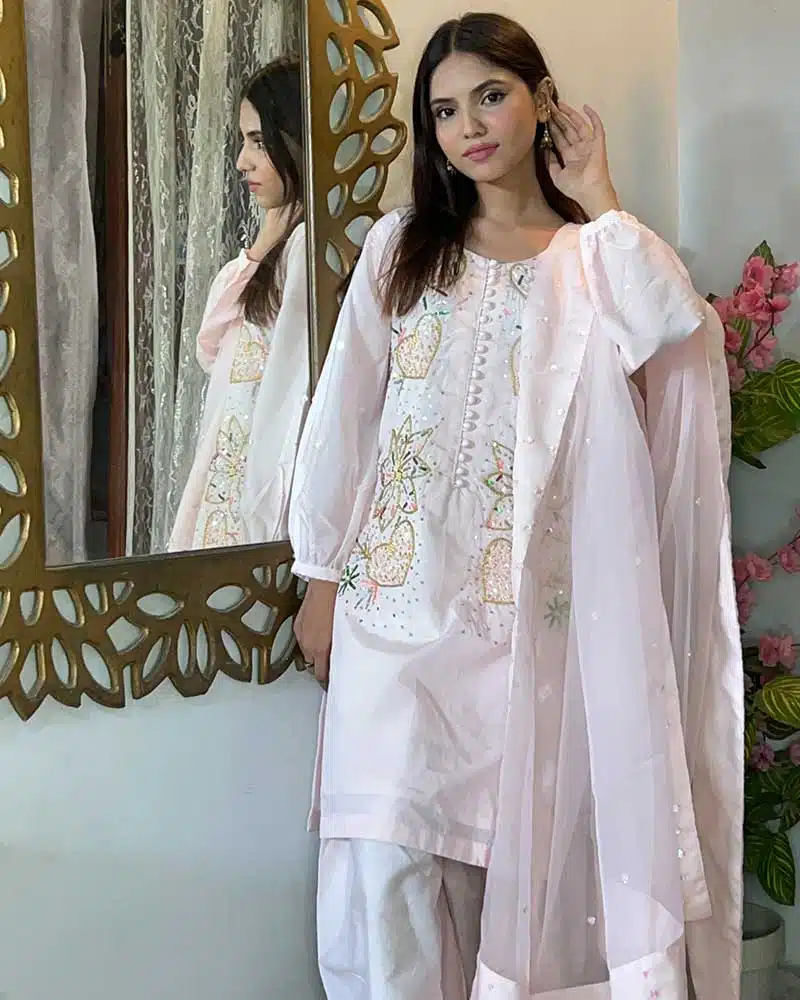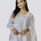 Immerse in pure sheesha silk ensemble, curated with care and love, giving a regal feel. This is 03 piece ensemble, featuring sequence and zardozi work over the neck line or the bottom according to pattern with loop buttons.